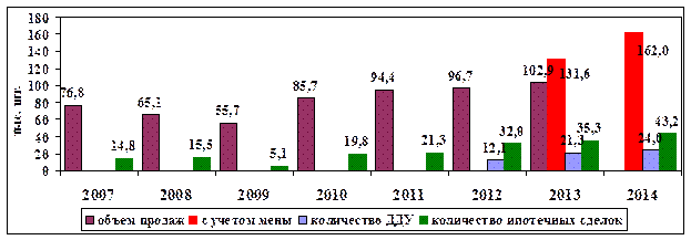 В Москве в 2014 году, несмотря на снижение темпов роста доходов населения, в результате весеннего и осеннего всплеска активности рынка было зарегистрировано (рис. 7) 162 тыс. сделок купли-продажи/мены на вторичном рынке жилья (рост на 23,7%), 24 тыс. договоров участия в долевом строительстве (рост на 22,7%), 43,2 тыс. договоров ипотеки (рост на 22,4%). По данным Росреестра Московской области, за январь-ноябрь 2014 г. число зарегистрированных договоров долевого участия в строительстве возросло на 33%. Высокая потребительская активность сохранялась и в декабре.