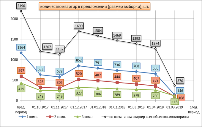 Спрос и предложение сбалансированы, как по характеристикам квартир, так и по стоимостным показателям. Рост стоимости предложения имеет перспективы роста, по крайней мере в течение полугода, в размерах текущей инфляции в РФ, и поддерживается существующей ставкой ипотечного кредита, в перспективе имеющей все шансы на снижение (январское заявление Президента РФ). С июля 2019 года, при переходе на банковское кредитование строительства и применение эскроу-счетов, желание застройщиков компенсировать свои потери в планируемых доходах с сохранением достигнутых экономических показателей в виде повышения стоимостных показателей, несомненно, приведёт к снижению спроса или снижению его медианной составляющей к минимальным значениям рынка предложения. В первую очередь это скажется на реализации у тех застройщиков, которые нарушат одно из золотых правил торговли: повышай медленно, снижай быстро. Лидирующие позиции в предложении сохранят предложения квартир в домах «эконом» - класса как минимум до конца 2019 года. Предложения в домах класса - «комфорт», при сохранении достигнутых параметров предложения/спроса, имеют все шансы на реализацию и выполнение застройщиками, взятых обязательств в части сроков ввода строящегося объекта в эксплуатацию.